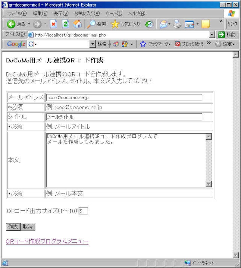 | (画像をクリックすると拡大表示できます) アドレス、タイトル、本文を入力し、作成するQRコードのサイズを指定し、作成ボタンを押します。 |
