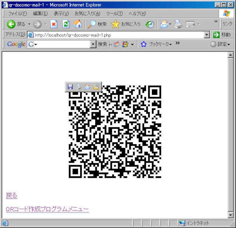 | (画像をクリックすると拡大表示できます) QRコードが作成されますので携帯のバーコード(QRコード)リーダーで読み取ります。 |
