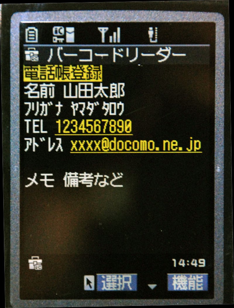 | (画像をクリックすると拡大表示できます) QRコードの読み込みに成功し、電話帳登録の確認画面が表示されました。 姓名、半角カナ、電話番号、メールアドレス、メモを確認し、メール作成を指定すると新規メールの画面が表示されます。 QRコードの読み取りがうまくできない場合はQRコードのサイズを変えて読み取りを試してください。 |