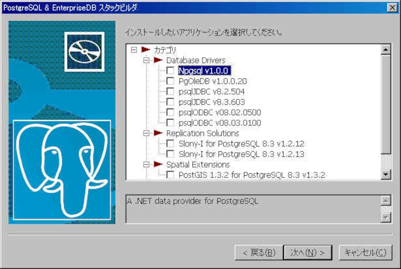 | (画像をクリックすると拡大表示できます) psqlODBC、JDBC、PostGIS等のインストールしたいアプリケーションを指定します。  |