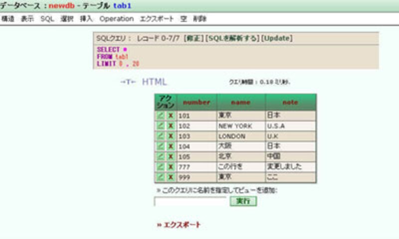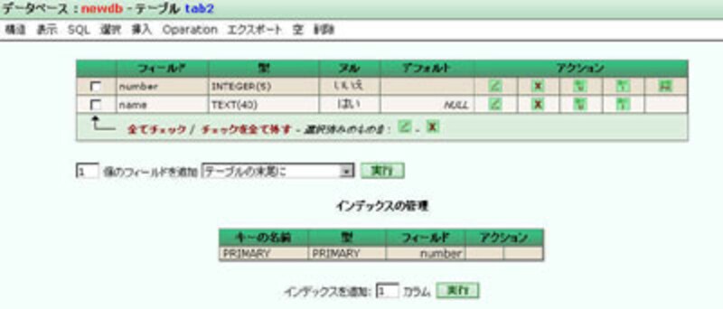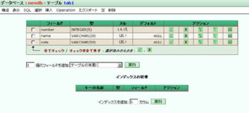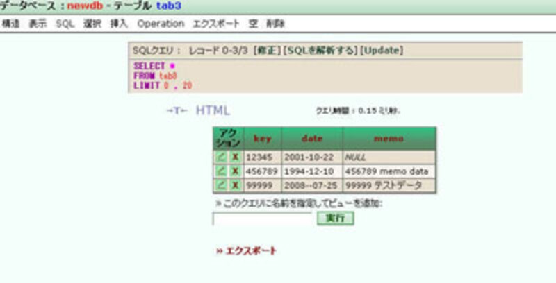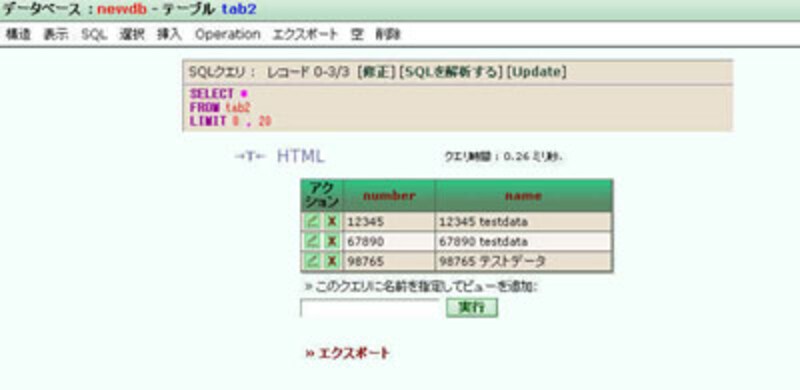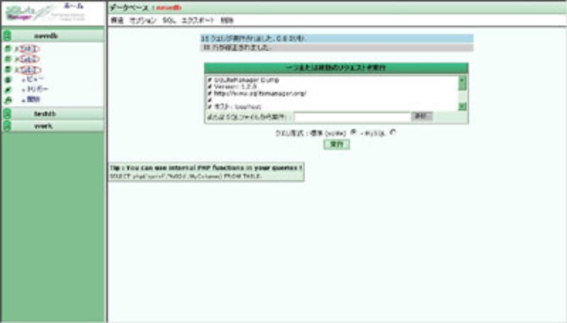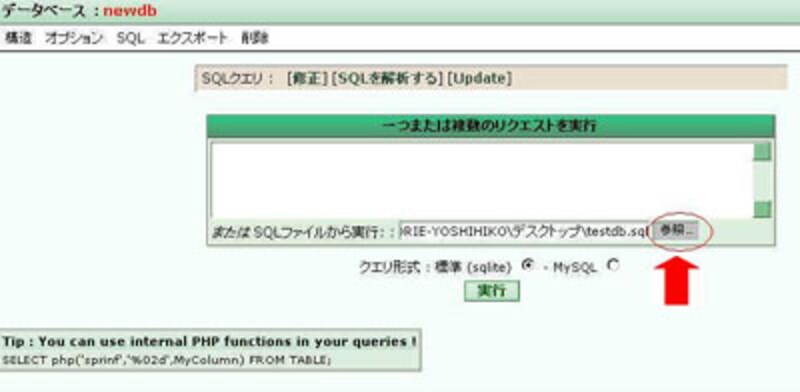 2. 「または SQLファイルから実行」の「参照」ボタンを押し、前ページでエクスポートしたファイルを指定した後、「実行」ボタンをクリックします。指定したSQLファイルが実行されテーブルが作成されます。