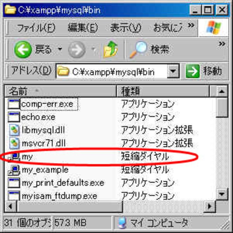 *注意: 「my.cnf」ファイルはWindows XPでは拡張子が表示されずに種類が「短縮ダイアル」と表示されているファイルです。「my.cnf」ファイルは設定を間違えた場合に元に戻せるように編集前に別名でコピーしておくことをおすすめします。