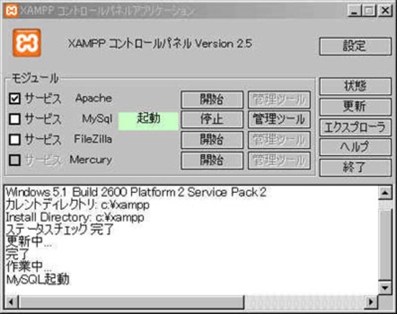 | XAMPPのコントロールパネル画面(画像をクリックすると拡大表示できます) |