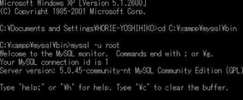 とタイプして改行キーを押し、MySQLのディレクトリに移動します。このパス指定が面倒な場合は、「MySQLのディレクトリをシステム環境変数「Path」に設定する」をしておきます。