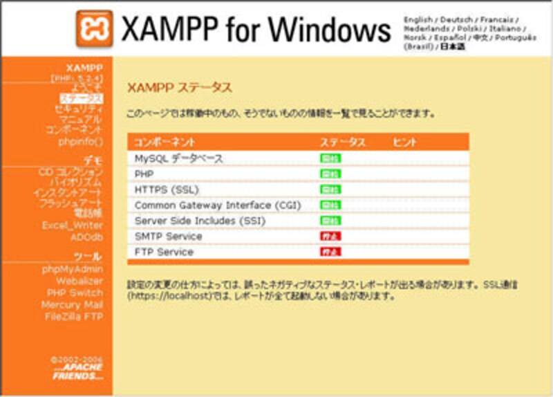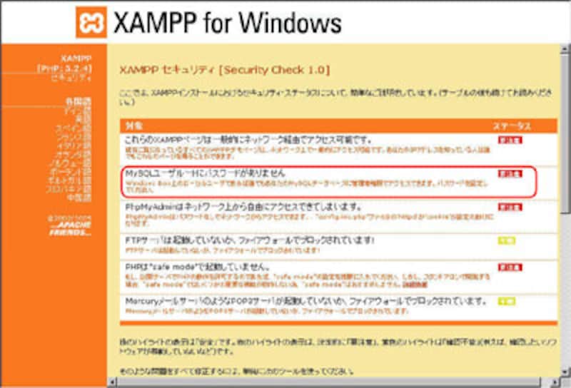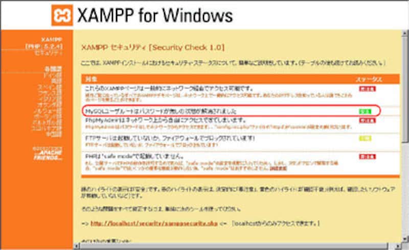 XAMPPのセキュリティの確認画面です。画面はMySQLのrootユーザーのパスワードを設定済みの場合の例です。