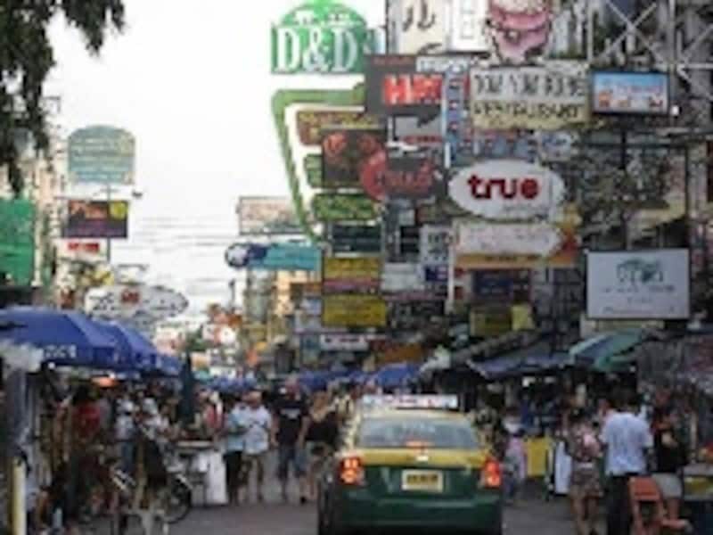 | カオサンにはゲストハウスだけでなく、格安チケットを扱う旅行社やリゾート用の服などが買える露店も多い |