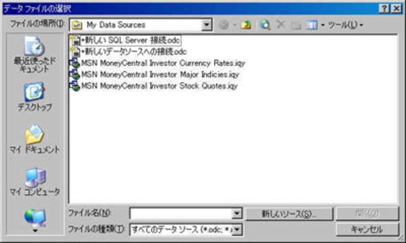 データファイルの選択の画面で「新しいソース」ボタンをクリックします。