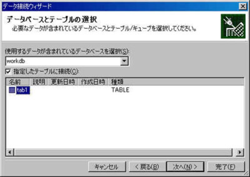 画面例ではMySQLのデータベース「workdb」のテーブル「tab1」のデータが取り込まれています。