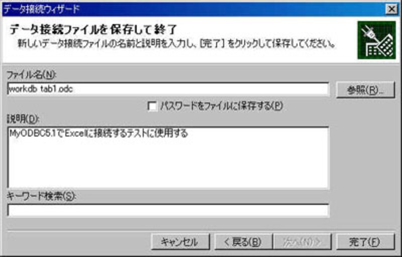 データ接続ファイルの名前と説明を入力し「完了」ボタンをクリックして保存します。