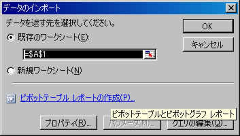 データを返す先(Excelのシート上のセルの位置)を指定し「OK」ボタンをクリックします。