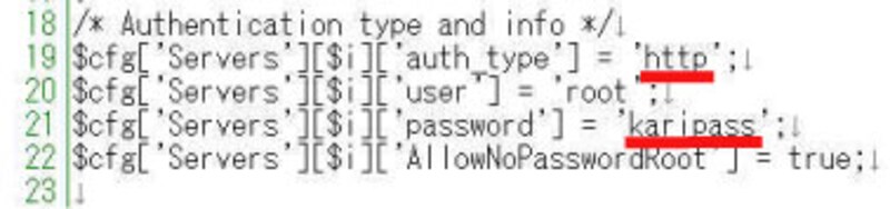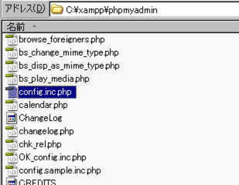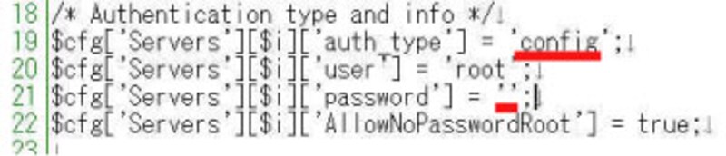上2点に対応するため「phpmyadmin」フォルダ内の設定ファイル「config.inc.php」を設定します。