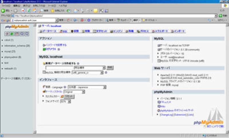 XAMPPをインストールした際に、ブラウザ上でMySQLの管理が可能なphpmyadminもインストールされおりすぐに 使用できる状態になっていますが、