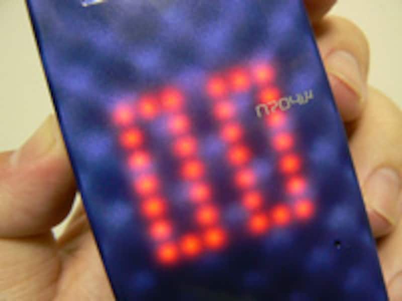 また、背面には7×7のLEDが埋め込まれている。普段は隠れて見えないが、着信時やケータイを閉じたとき、音楽再生時などに様々に光るようになっている。