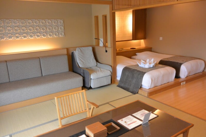 別館宿泊者の専用カウンターでチェックインを済ませたら、「別館客室専用エントランス」から客室へ。広いツインの和洋室にはマッサージチェアも設置されており、湖を一望しながらゆったりと過ごすことができます。