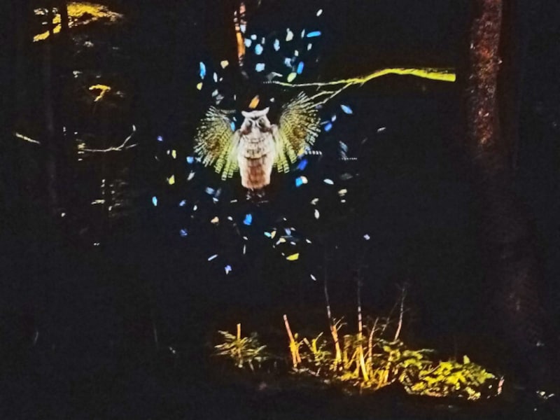 カケス。森の暗闇の中や木々に投影される可愛いキャラクターの姿を追いながら、参加者は森の奥へ奥へと足を運んで行きます。