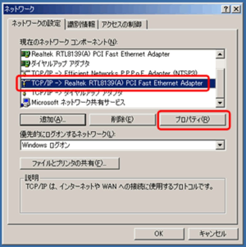 | 「現在のネットワークコンポーネント」から「TCP/IP -> LANカードの名前」を選択→「プロパティ」をクリック。 |