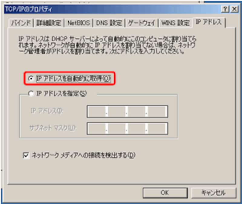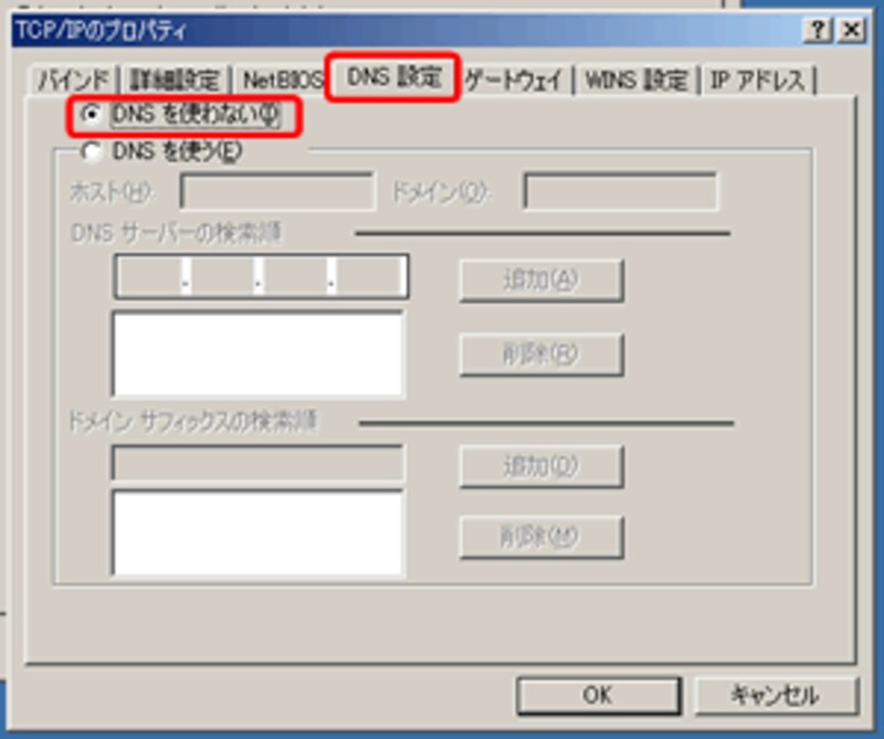 | 「TCP/IPのプロパティ」が開いたら、「IPアドレス」「DNS設定」「ゲートウェイ」タブをクリックし、それぞれを説明書とおりに設定。(筆者の場合、初期設定のままでOKだった。)「OK」を押してすべての画面を閉じる→「再起動しますか?」というメッセージが出たら「はい」をクリックしてパソコンを再起動する。 |