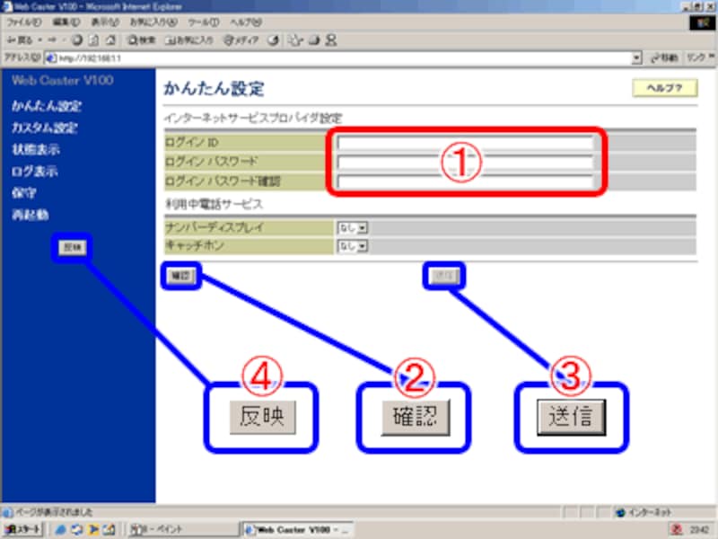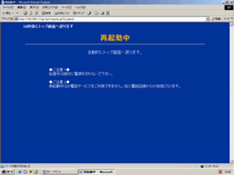 | 機器の設定画面が表示される。この画面から機器のさまざまな設定ができる。 「かんたん設定」画面から、ログインID、ログインパスワード欄に、インターネット接続する際に必要なプロバイダのログインID、パスワードを入力する。(IP電話サービスのそれではないので要注意) 入力したら、「確認」→「送信」→「反映」ボタンをクリックすると、機器が再起動され、以下の画面に変わる。 60秒ほど待つと、「かんたん設定」画面に戻る。 |