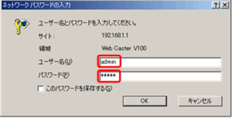 | 「ネットワークパスワードの入力」画面が出るので、ユーザー名、パスワードを入れる。両者は機器の設定画面に入るためのものなので、マニュアルに記載されているものを入力する。 |