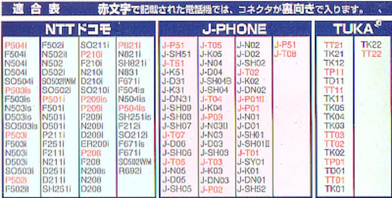 携帯に接続する方のコネクターには、「表」と「裏」があります。適合表で赤文字記載されている機種はコネクタの裏を上にして差し込む必要があります。いくつかの機種で試してみたところ、正しい向きでないと携帯に接続できなかったので、そういう機種はあまり心配する必要はないと思います。使い始める際に、逆向きで接続出来るかを試してみて、逆でも繋がってしまう機種の場合は注意が必要です。