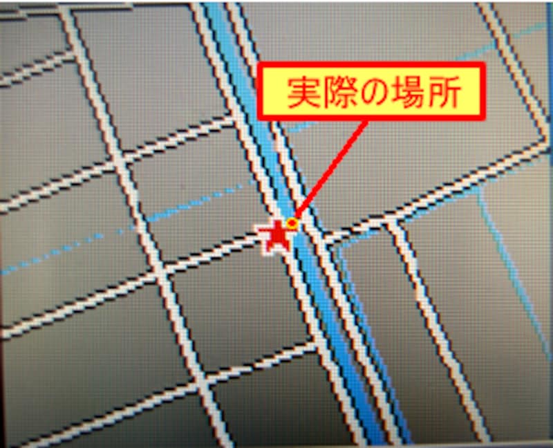 | (★が実際の位置) 住宅地からはずれた田んぼなど、GPSの衛星がモロに見える場所では「ココセコム」に軍配が上がりました。この場所での測定では、誤差はわずか3m程度。一方、基地局が近くにないPHSの「いまどこサービス」はとんでもなく離れた場所が表示され、誤差は1000m以上。郊外では、PHSは惨敗です。 |