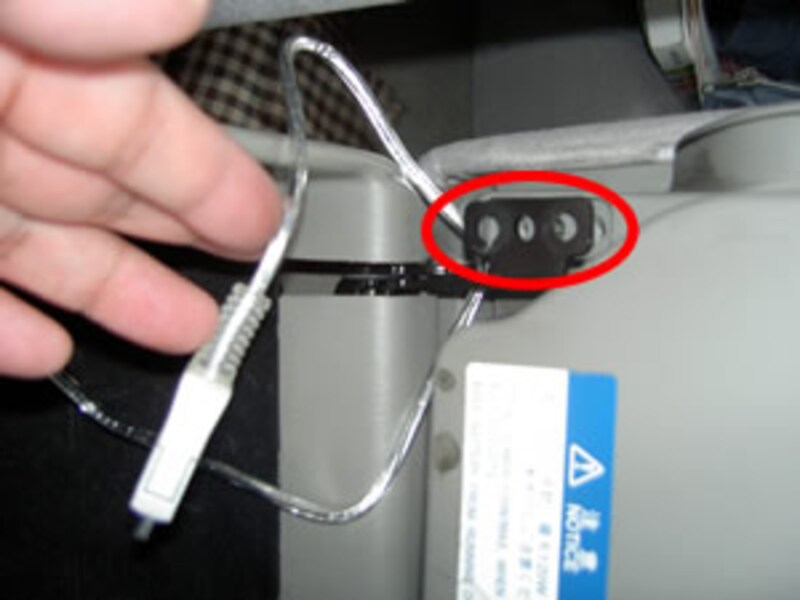 ![]() ドライバーで蝶つがいをはずし電源コードを通す ![]() |