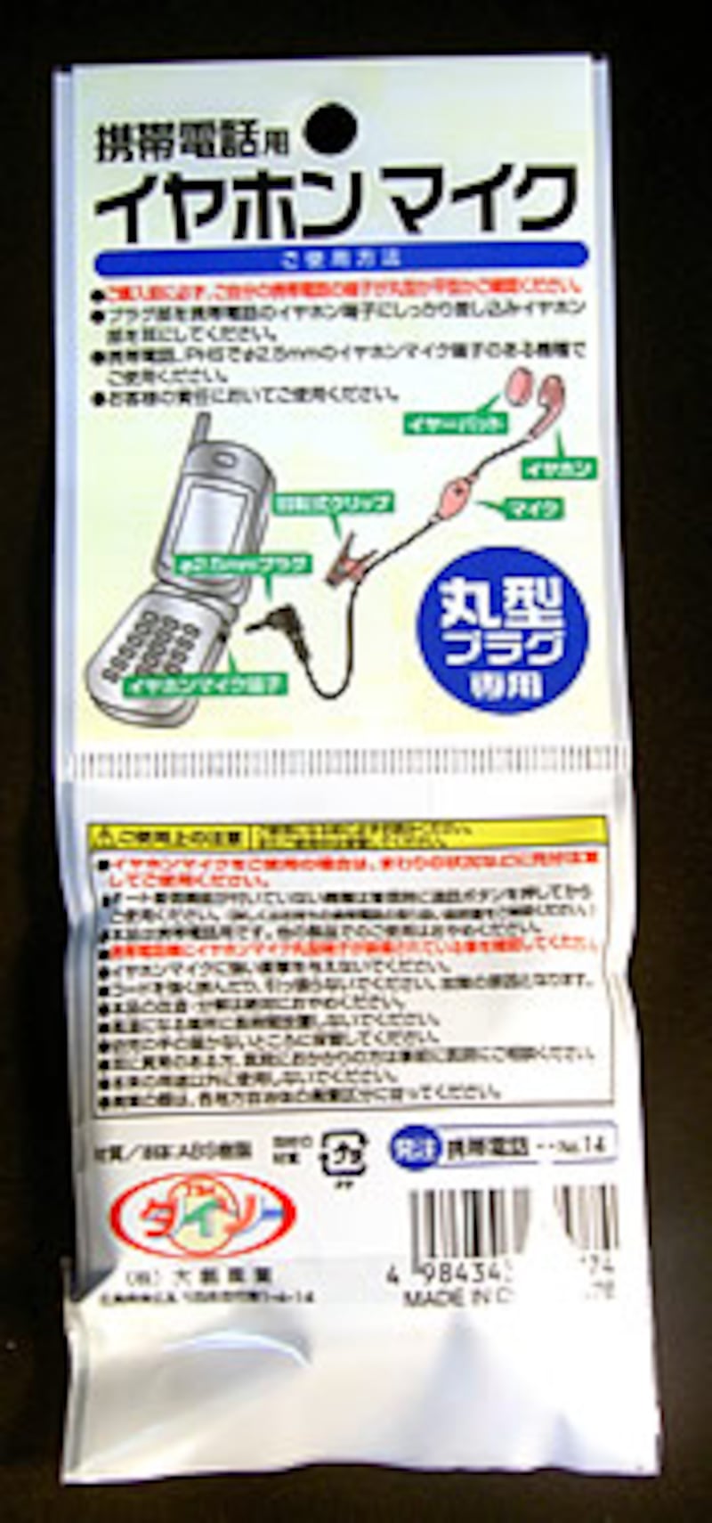 大好評を博したガイド記事『100円USB携帯充電器は使え るゾ!』でもご紹介したダイソーで今回発見したのは「イヤホンマイク」。パッと見、タダの片耳イヤホンのようですが、途中にマイクが付いていて、携帯電話に接続すると会話ができるというグッズです。