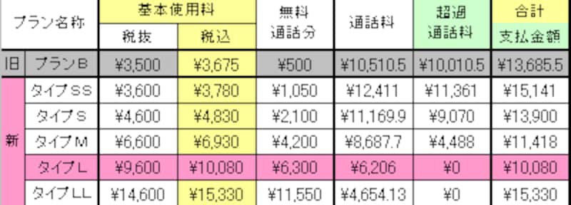 プランBの通話料が10,510.5円の場合、無料通話分の500円が相殺され、合計支払金額(*2)は13,685.5円となります。新料金プランの「タイプL」の場合、プランBと比較すると3,606円安くなりもっともお得です。