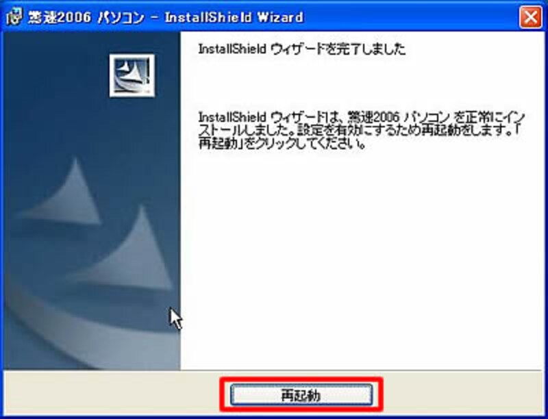 完了を知らせる画面がでたら、「再起動」ボタンをクリックすると自動的にパソコンが再起動します。