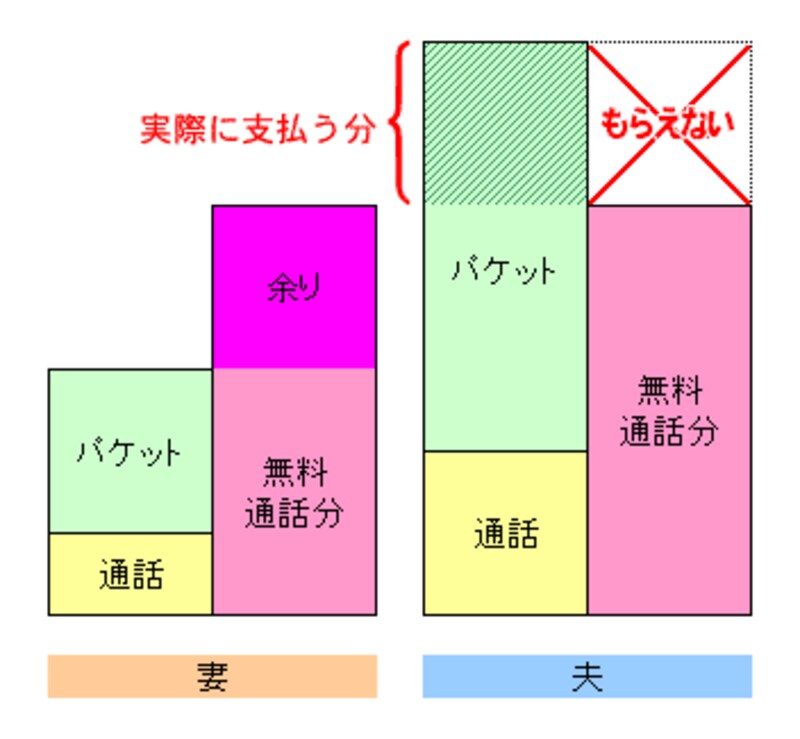 | 妻の無料通話分の余りが、一部だけ夫に分けられるケース。家族の余った無料通話分は、通話料には適用されるが、パケット通信料には適用されない。 |