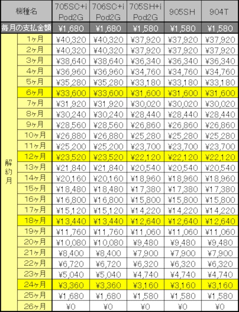 ◆中途解約時の残金一覧表 【機種変更・買い増し】