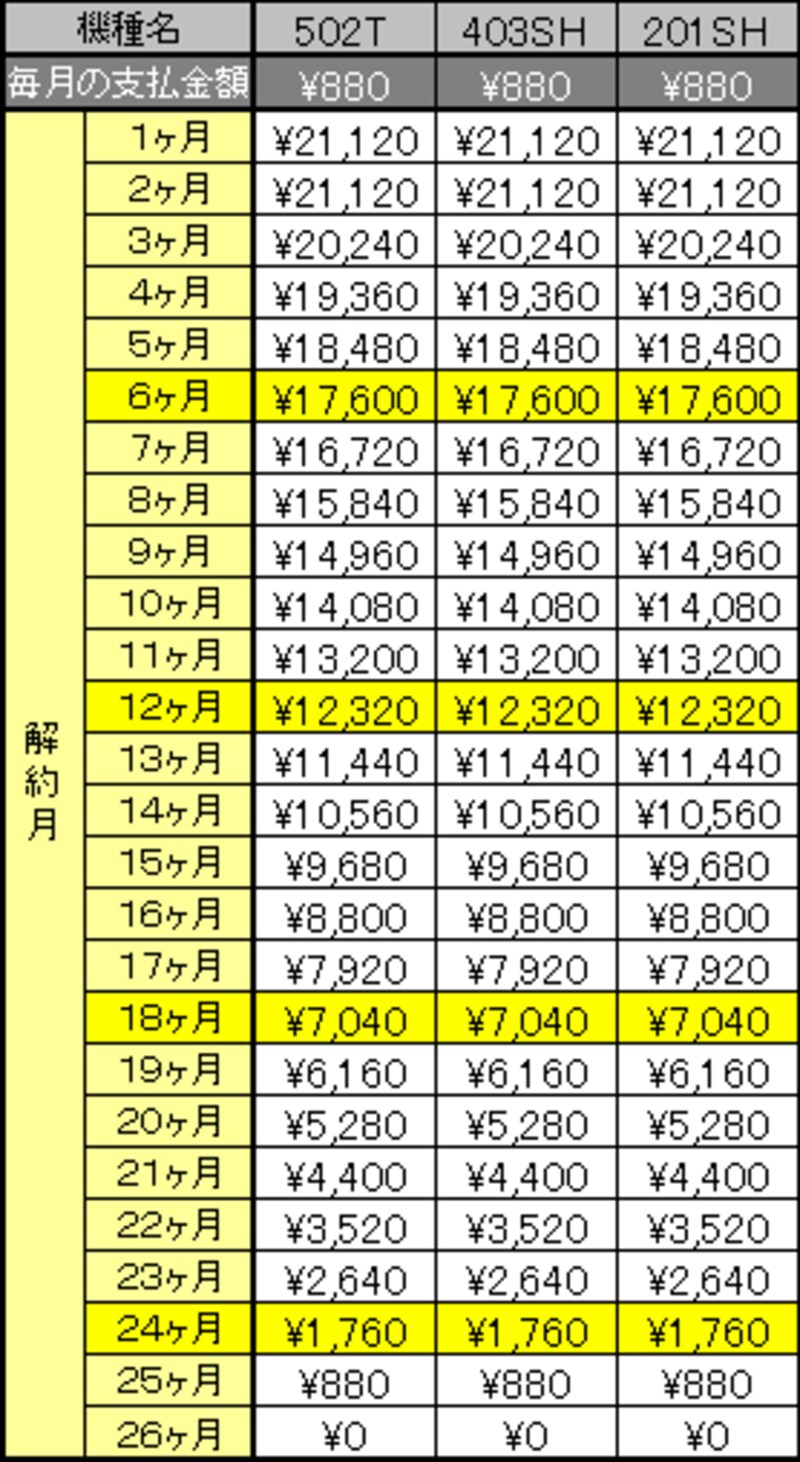 ◆中途解約時の残金一覧表 【機種変更・買い増し