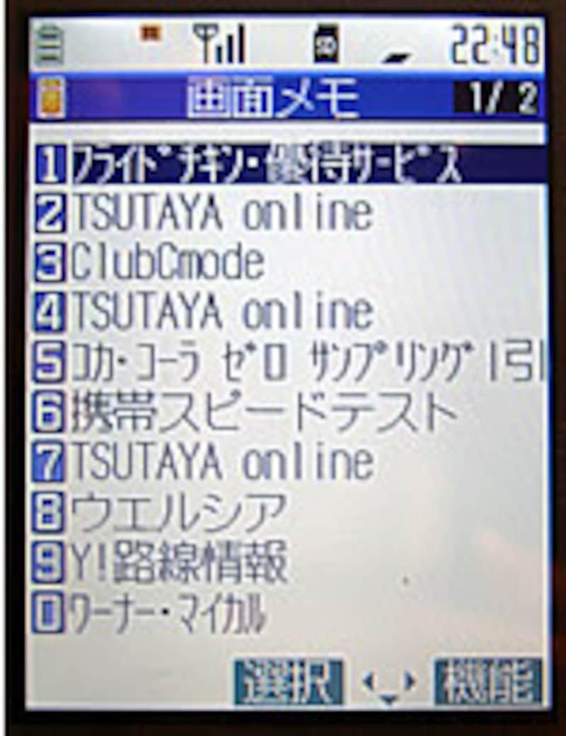 | 画面メモに保存をすると、サイトに接続しなくても保存したページが読み出せる。ドコモ・FOMAの場合はiモードボタンを押し「画面メモ」を選ぶと一覧がでてくる。(写真右) |
