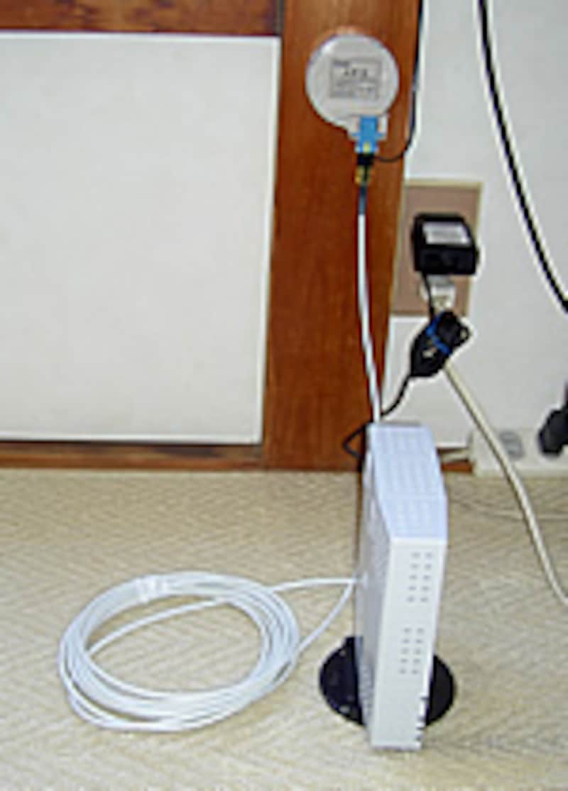 | 手前の白い機械が、回線終端装置(ONU)。ここからLANケーブルでパソコンへ接続する。 |