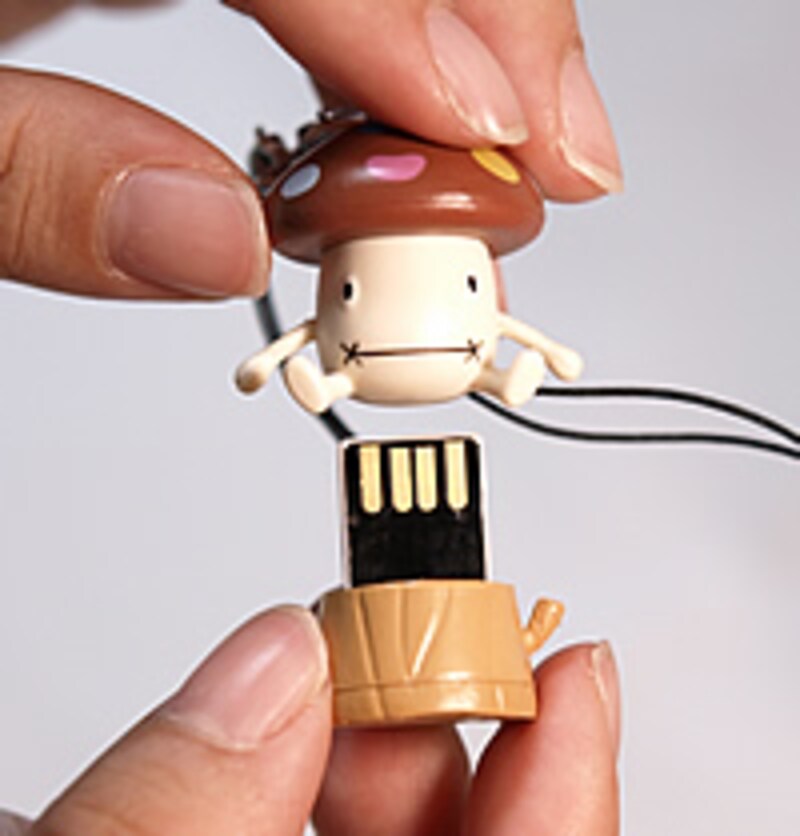 ところが、ドコモダケが座っている切り株と、本体を少し強く引っ張ると……取れてしまいました! 一瞬「壊しちゃった?」というような手応えですが、なんと中から、USBメモリのようなものが出てくるではありませんか!
