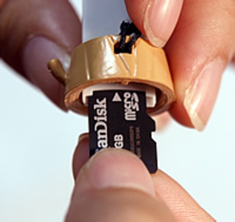 microSDカードを奥まで入れ、フタを閉め、本体とくっつけると元通り! 普通のストラップになっちゃいます。