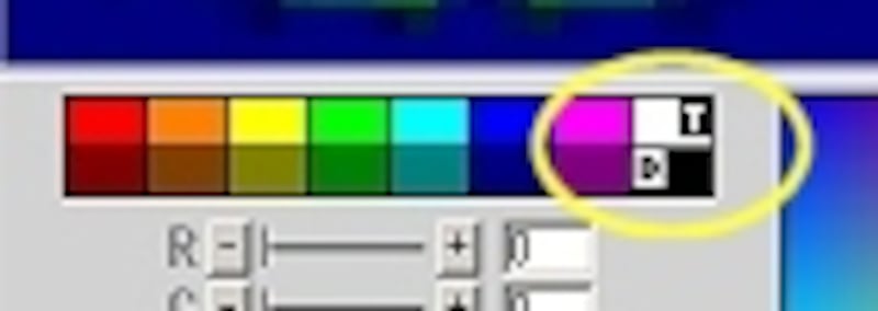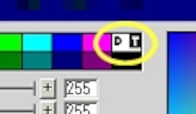 このカラーパレットの「T」と表示されているところが透明になる色です。現在は「白」になっています。 |