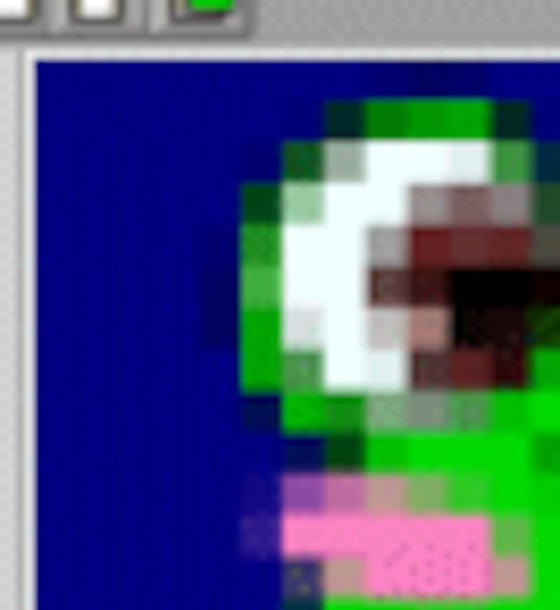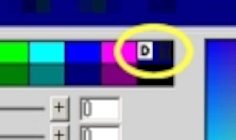 カエルの背景の「濃い青」を透明色に指定させるには、まず「T」のパレットをクリックします。すると、「D」も表示されます。「D」は現在の描画色を示しています。 |