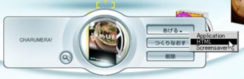 [SAVE]画面で保存をすると、[シアター]画面に切り替わり、[あげる]ボタンをクリックすると保存した作品をCD-Rなどに収録用の独立アプリケーションで保存するか、ホームページで見てもらうためのShockwaveとHTMLの形式で保存するか、またはスクリーンセーバーに変換するかを選ぶことができます。ここでは[HTML]を選んでみます。