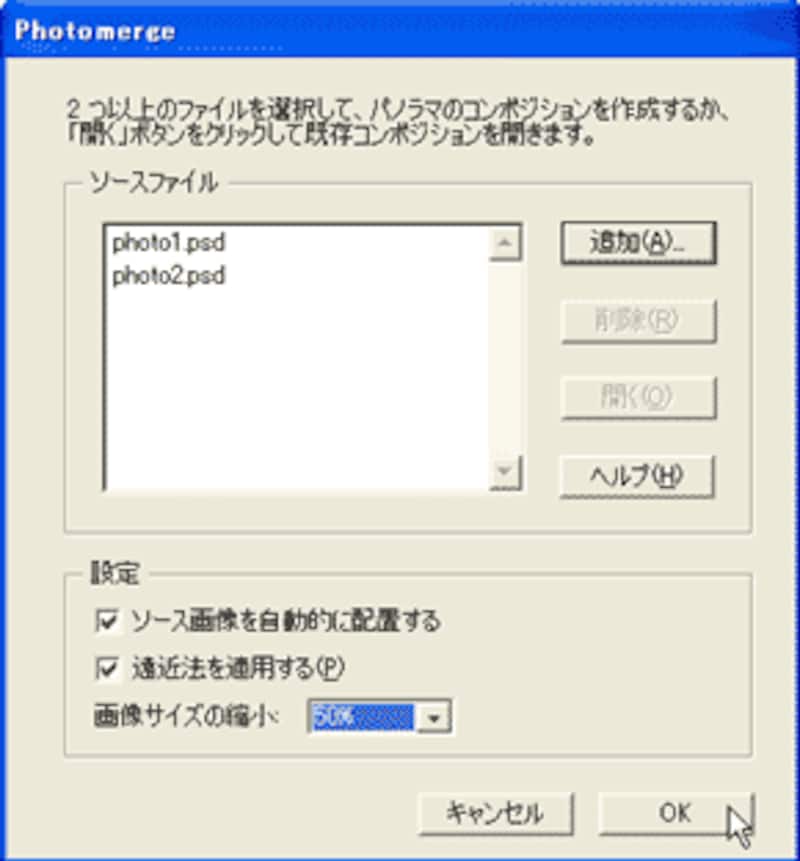 [追加]ボタンをクリックして、保存した2つの画像を指定します。元画像が大きい場合は[画像サイズ]で任意の縮小率を設定します。OKをクリックします。