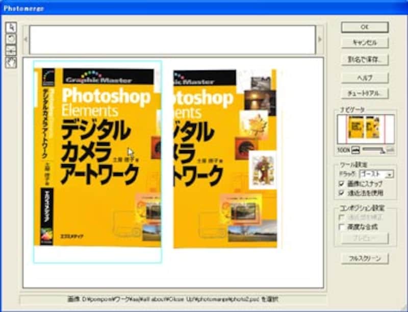 Photoshop Elementsのスキャナで2回に分けて読み込んだ本の表紙画像です。一方は傾いた状態になっています。これを一度任意の画像ファイル名をつけて保存しておきます。
