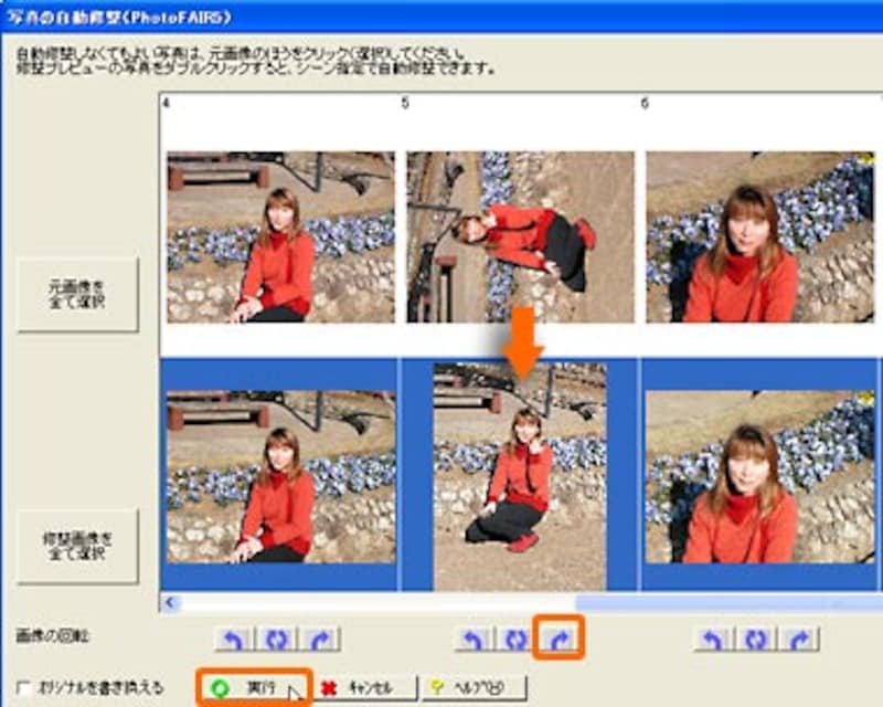 また、カメラを縦や逆さにして写した画像を回転修正したい場合は、該当する画像の下のにある[回転]ボタンを押して起こします。修正が完了したところで[実行]ボタンをクリックします。[修整]の[回転]を選択して回転修整のみを行うこともできます。