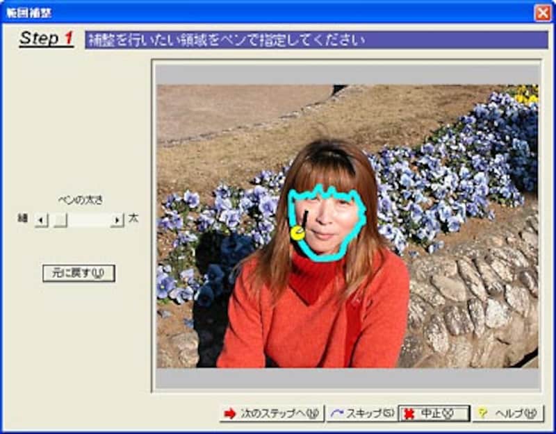 [ペンの太さ]を細めに設定して、顔の肌の部分をドラッグ選択します。[次のステップへ]ボタンをクリックして次に進みます。