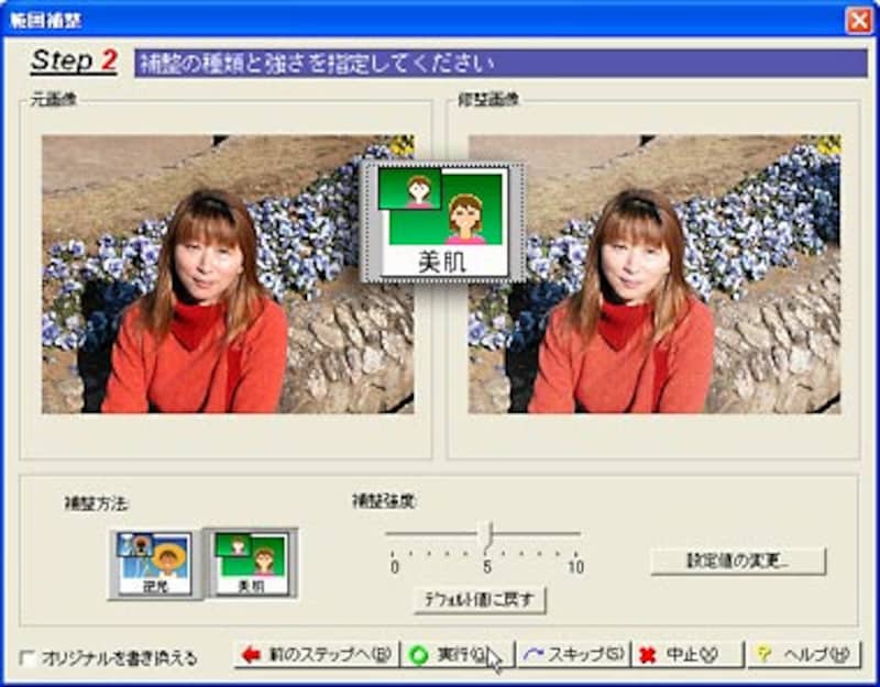 [美肌]ボタンをクリックして、[補整強度]のスライダをドラッグして、効果の強弱を調整します。右画像の顔の色があまり明るくなりすぎない程度に調整し、[実行]ボタンをクリックします。