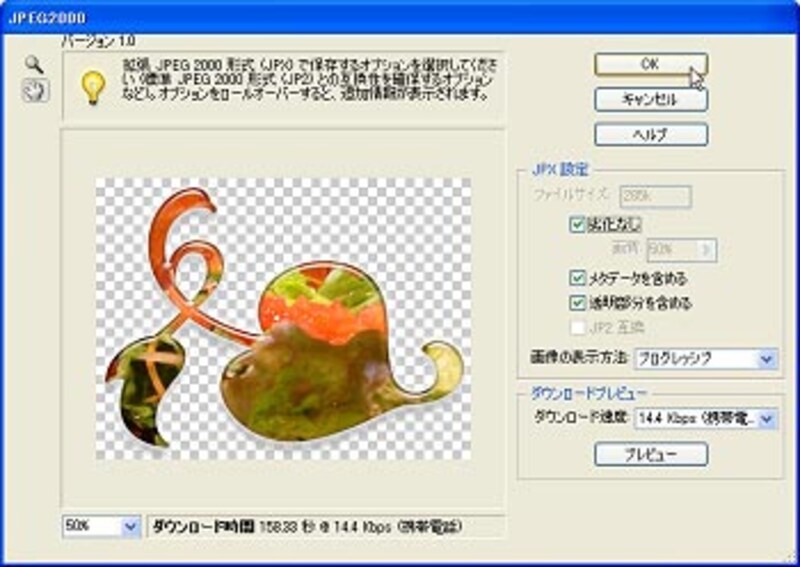 Phtoshop Elements2.0でJPEG 2000形式保存の際の設定画面