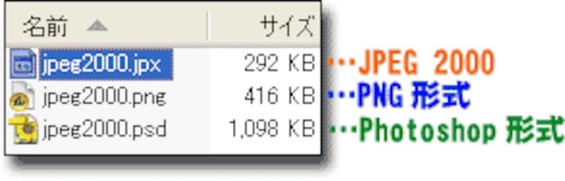 JPEG 2000は圧倒的にサイズが小さいということから、Phtoshop Elements2.0で作成した透明を含む画像を、小さいサイズのメディアなどに保存しておく場合に便利かと思います。
