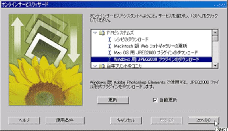 [アドビシステムズ]フォルダの[Windows用JPEG2000プラグインのダウンロード]もしくは[Mac OS用JPEG2000プラグイン]を選択して、[次へ]をクリックします。