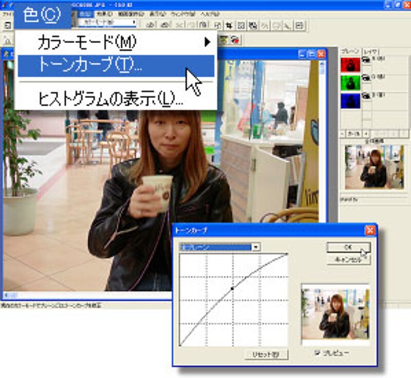 「ラボ作業」を起動させると、本格的な明るさや色の補正を、トーンカーブやヒストグラムで行うこともできます。
