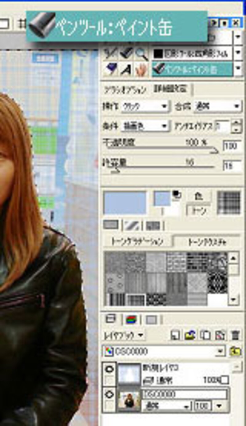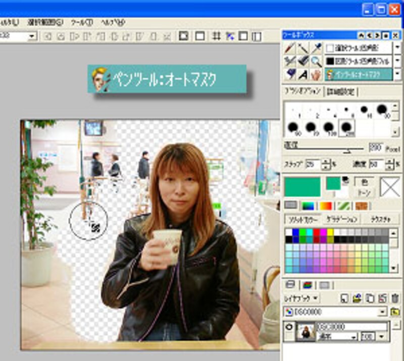 ペンツールの[オートマスク]を使うと、円形のブラシをクリック&ドラッグすることで、ブラシの中心の色と近い部分を自動的に感知して、透明にすることができます。人物だけを残して、その背景を透明にしたい場合に便利です。