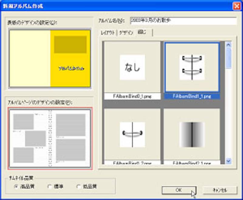 表紙・裏表紙の色やデザイン、アルバムページのレイアウト、また中綴じのデザインを選択すると、自動的に画像がページに配置されます。